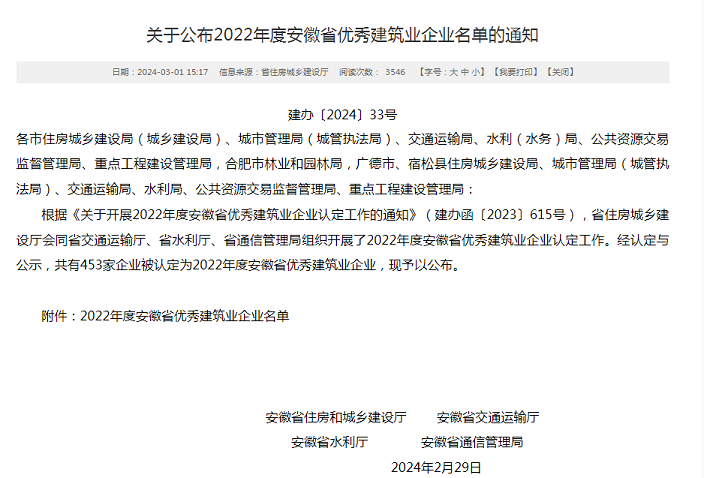 近日,安徽省住房和城鄉(xiāng)建設(shè)廳發(fā)布了“2022年度安徽省優(yōu)秀建筑業(yè)企業(yè)”名單,黃山建工集團(tuán)憑借企業(yè)經(jīng)營發(fā)展、管理創(chuàng)新能力、企業(yè)建造能力、企業(yè)文化建設(shè)、社會(huì)責(zé)任履行等方面的卓越表現(xiàn)再次名列榜單――建筑工程總承包類(特級(jí)、一級(jí)類別)省優(yōu)秀建筑業(yè)企業(yè),連續(xù)多年斬獲該項(xiàng)殊榮。