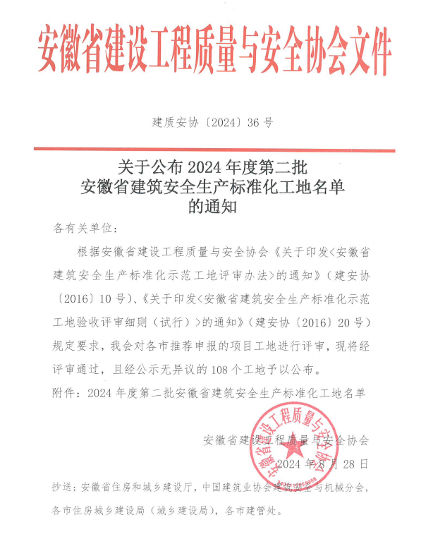 近日,安徽省建設(shè)工程質(zhì)量與安全協(xié)會公布2024年度第二批安徽省建筑安全生產(chǎn)標準化工地名單,由黃山建工集團承建的國網(wǎng)安徽黃山供電公司運維檢修及信息通信用房項目光榮上榜。