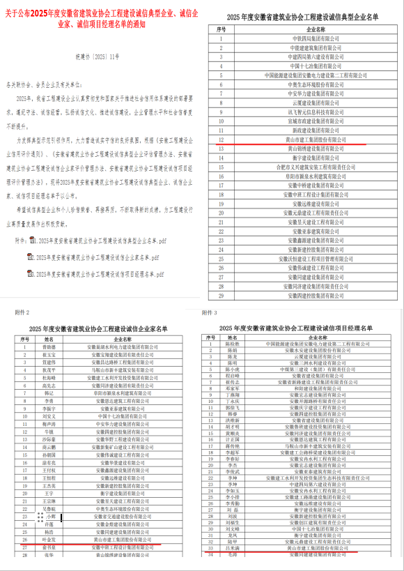 近日,國家及省級行業(yè)協(xié)會相繼公布關(guān)于2025年度工程建設(shè)領(lǐng)域系列信用評價與先進評選的結(jié)果,黃山市建工集團股份有限公司憑借卓越的綜合實力、良好的市場信譽和穩(wěn)健的經(jīng)營表現(xiàn),在多個權(quán)威評選中脫穎而出,收獲累累碩果,再次彰顯了公司在行業(yè)內(nèi)的領(lǐng)先地位與誠信標桿形象。